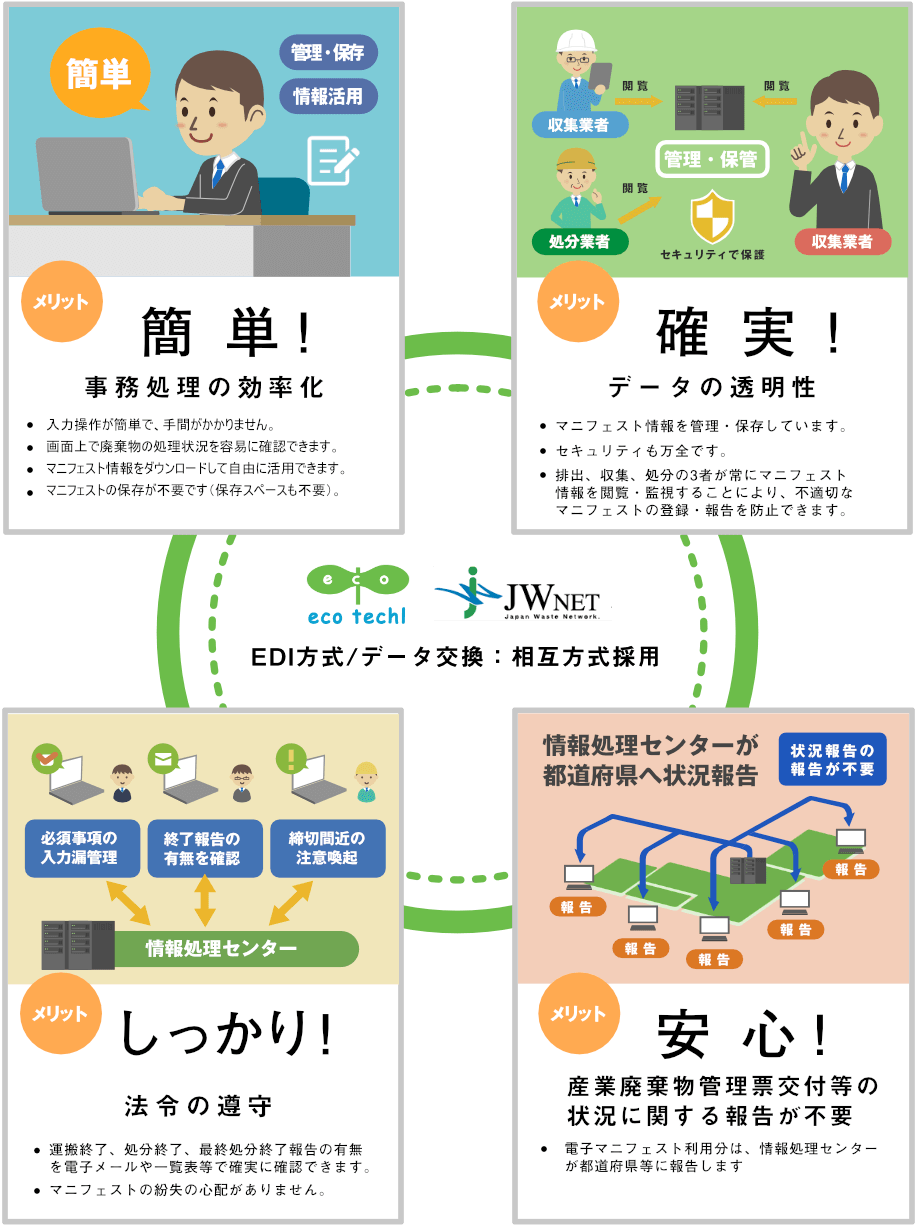 産業廃棄物SDGs推進システム(略称:SDGsシステム)は、紙マニフェスト・電子マニフェストの双方に対応しておりますので、廃棄物情報(マニフェスト情報)を一元管理することが可能です。集積した廃棄物データは、国や地方行政あるいは廃棄物業界団体が進める「産業処理業者の優良性評価制度」をはじめ様々な環境政策・廃棄物施策にお役立て頂けると考えております。